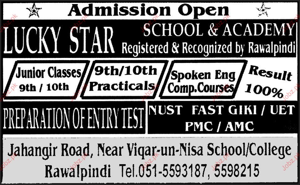 Admission Open in Junior Ciasses IX and X in Lucky Star School & Academy in Rawalpindi Read newspaper ad for exact details.