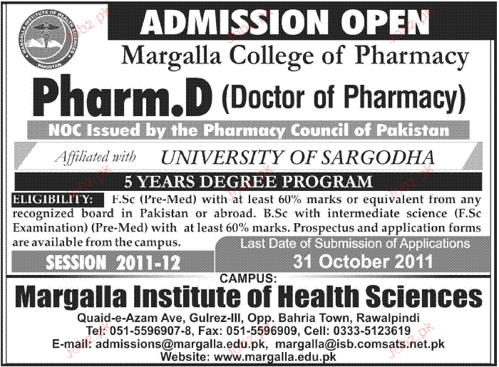 Admission Open in Margalla College of Pharmacy in Rawalpindi Read newspaper ad for exact details.