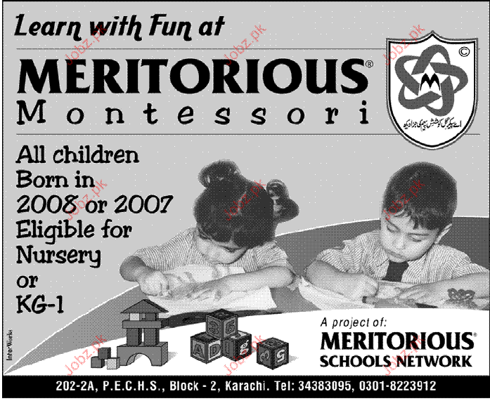 Admission Open in Montessori in Meritorious Montessori in Karachi Read newspaper ad for exact details.