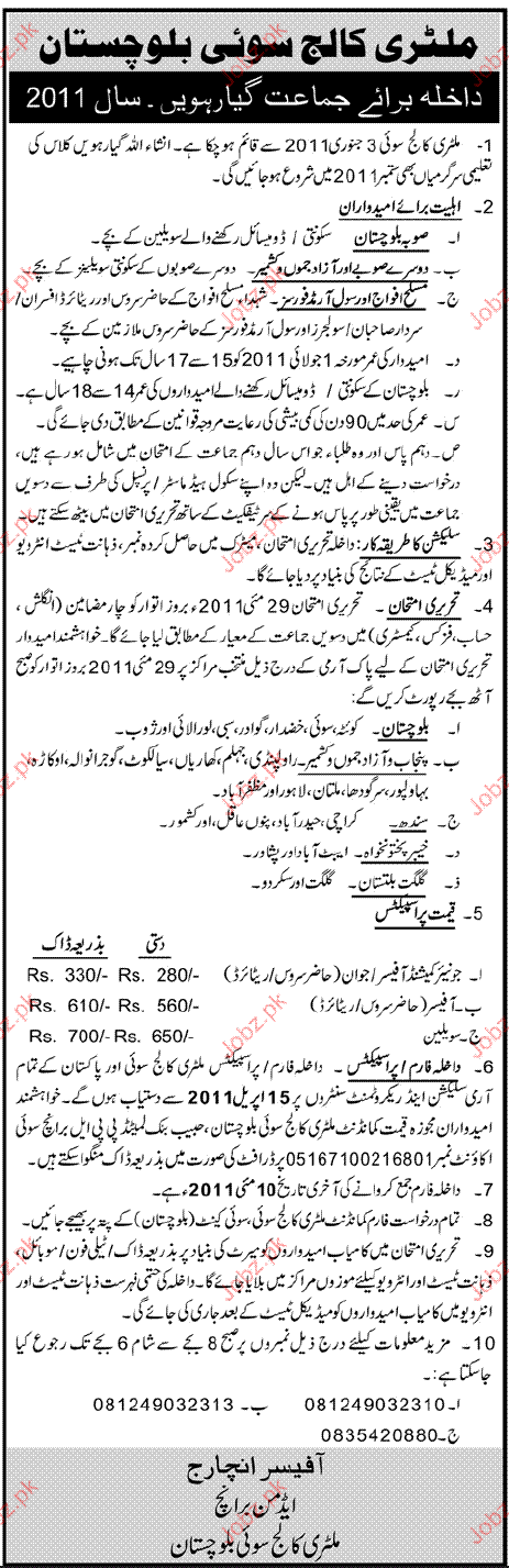 Admission Open in XI in Military College Sui Balochistan Read newspaper ad for exact details.