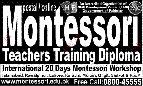 Admission Open in Montessori Teacher Training Diploma in Lahore Read newspaper ad for exact details.
