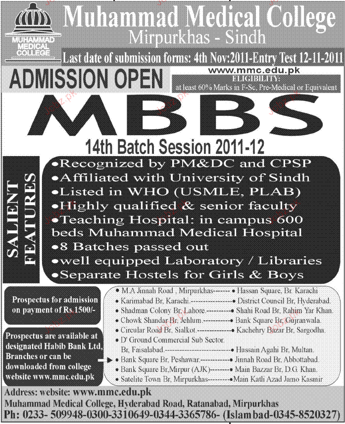 Admission Open in Muhammad Medical College in Mirpurkhas Read newspaper ad for exact details.