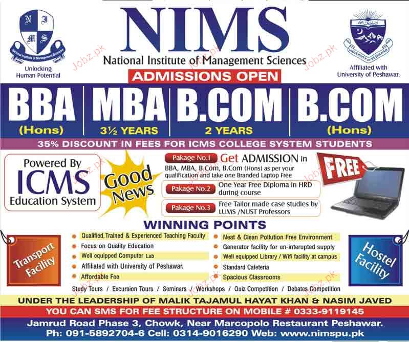 Admission Open in National Institute of Management Sciences in Peshawar Read newspaper ad for exact details.