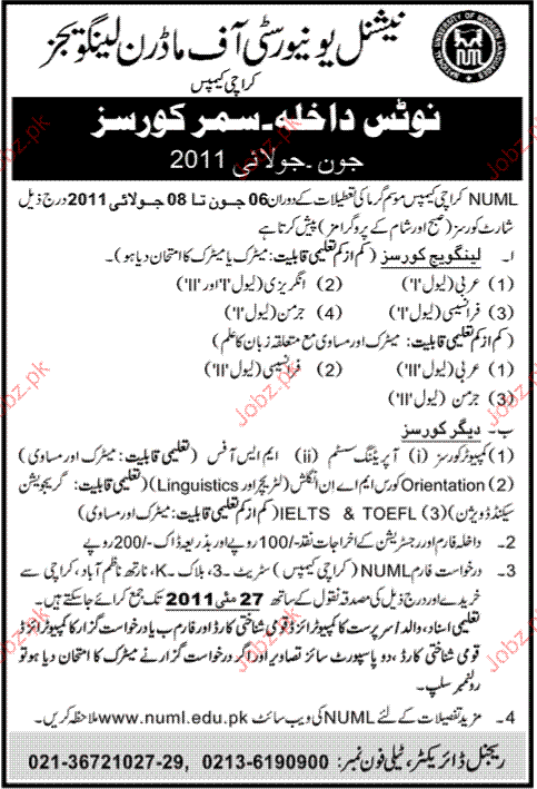 Admission Open in Different Language Courses in National University of Modern Languages in Karachi Read newspaper ad for exact details.