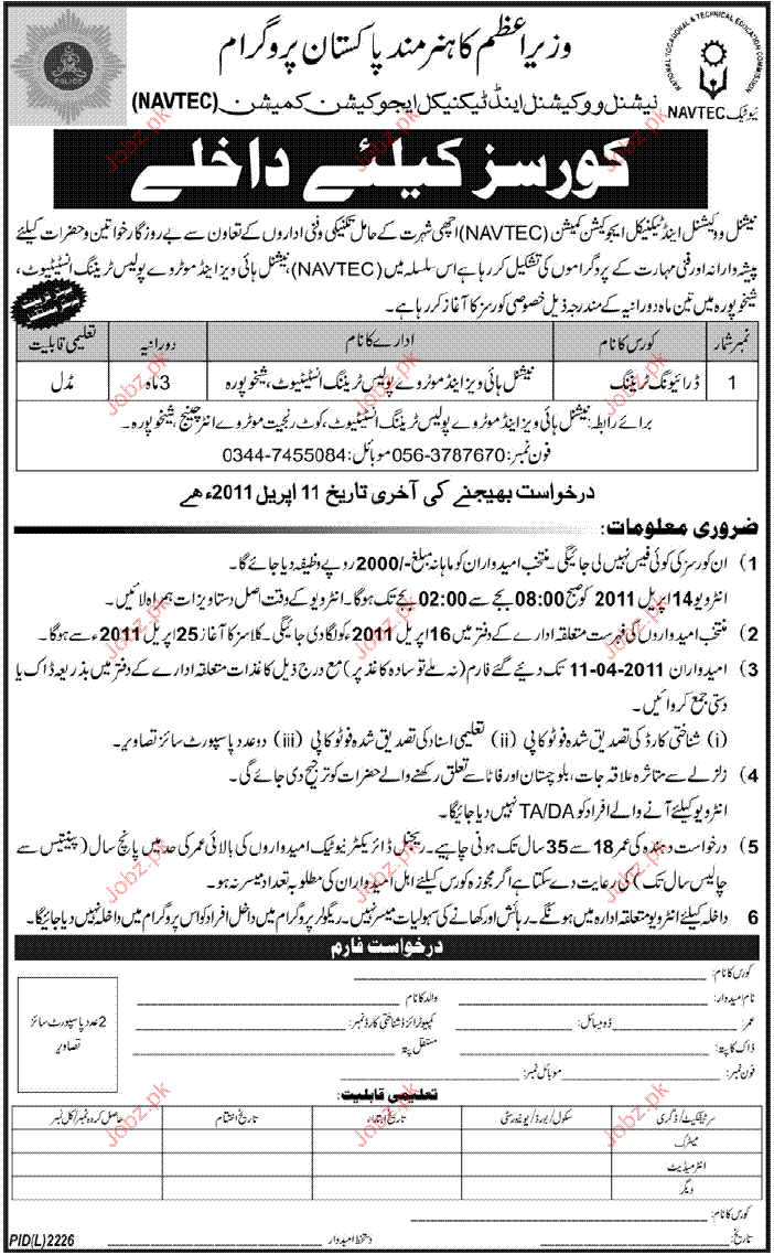 Admission Open in Courses in National Vocational & Technical Education in Lahore Read newspaper ad for exact details.