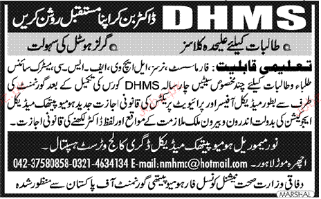 Admission Open in Nur Memorial Homeopathic Medical College in Lahore Read newspaper ad for exact details.