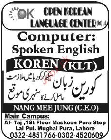 Admission Open in Spoken English and Korean in Open Korean Language Center in Lahore Read newspaper ad for exact details.