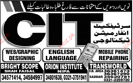 Admission Open in Information Technology, English Language, Mobile Phone Repair and Web Designing in Orion Institute in Karachi Read newspaper ad for exact details.