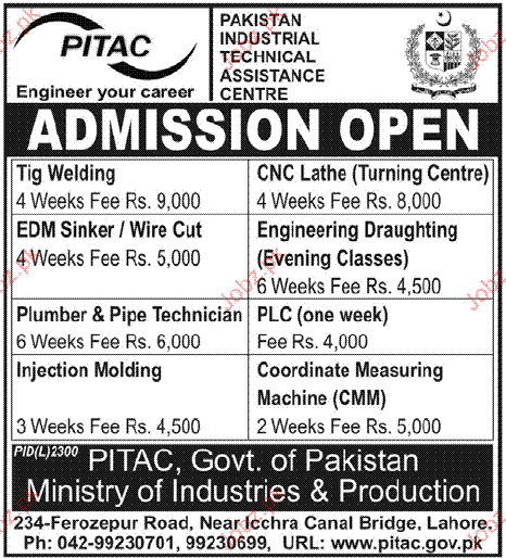 Admission Open in Different Courses in Pakistan Industrial Technical Assistant Centre in Lahore Read newspaper ad for exact details.