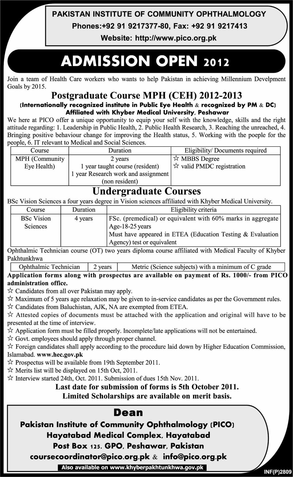 Admission Open in Pakistan Institute of Community in Hyderabad Read newspaper ad for exact details.