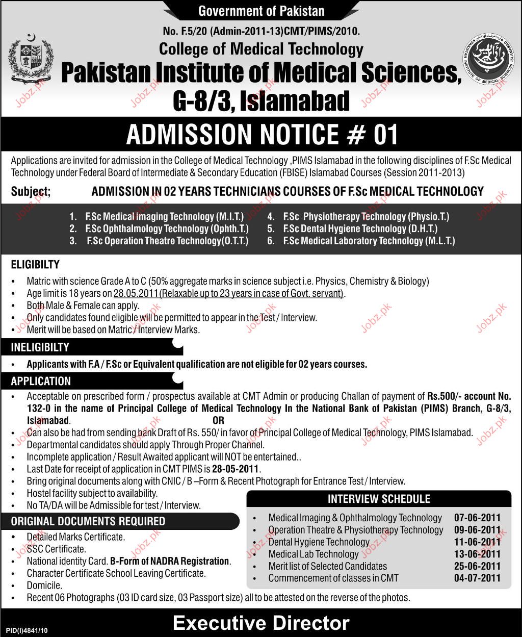 Admission Open in Technician Courses in Pakistan Institute of Science in Islamabad Read newspaper ad for exact details.
