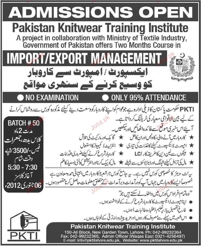 Admission Open in Pakistan Knitwear Training Institute in Import / Export Management in Lahore Read newspaper ad for exact details.