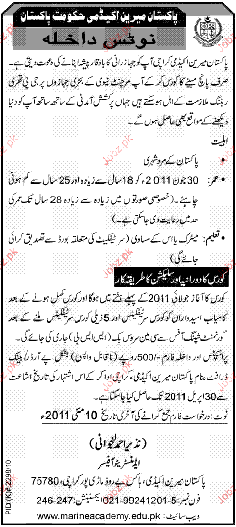 Admission Open in Pakistan Merine Academy GOvt of Pakistan in Karachi Read newspaper ad for exact details.