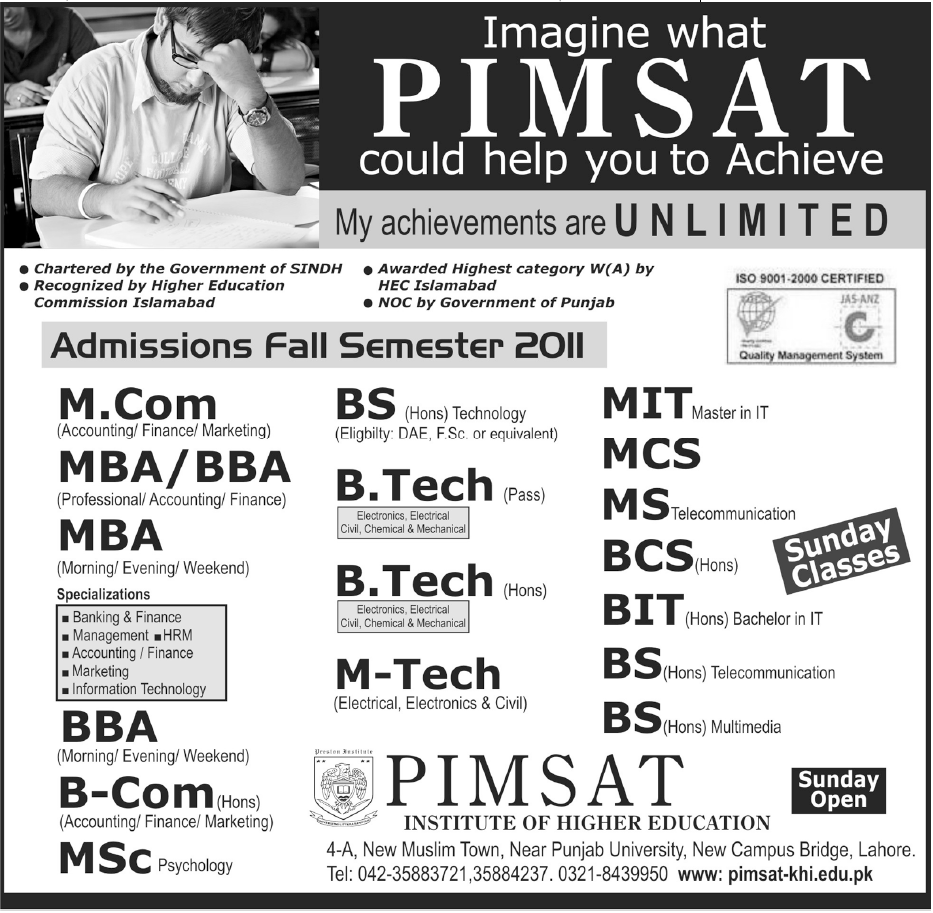 Admission Open in PIMSAT Institute of Higher Education in Lahore Read newspaper ad for exact details.