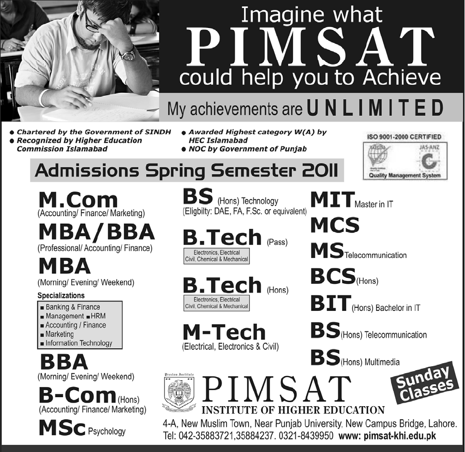 Admission Open in Class M.Com, Bs, MITm MBA, B-Tech, MCS, BSC and BBA in PIMSAT in Lahore Read newspaper ad for exact details.
