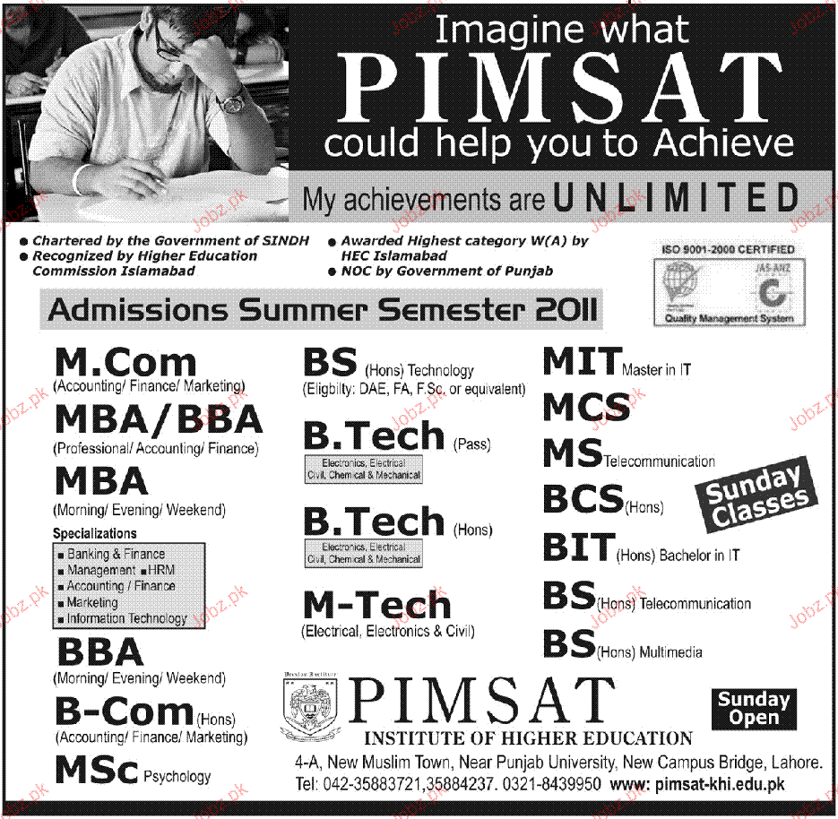Admission Open in PIMSAT in Lahore Read newspaper ad for exact details.