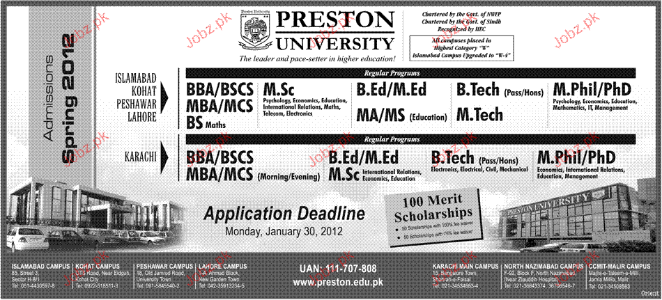 Admission Open in BBA, BSCS, B.E,M.phill, and B.Tech in Preston University in Karachi Read newspaper ad for exact details.