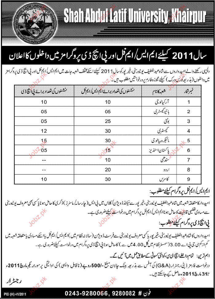 Admission Open in Class Ms,M.Phill and Phd in Shah Abdul Latif University in Khairpur Read newspaper ad for exact details.