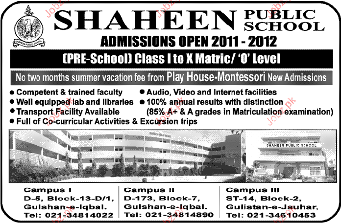 Admission Open in Shaheen Public School karachi Read newspaper ad for exact details.