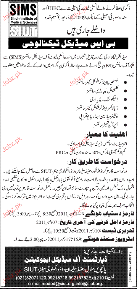 Admission Open in Sindh Institute of Medical Sciences in Karachi Read newspaper ad for exact details.