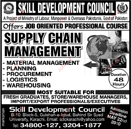 Skill Development Council Offers Job Oriented Professional Course in Karachi Read newspaper ad for exact details.