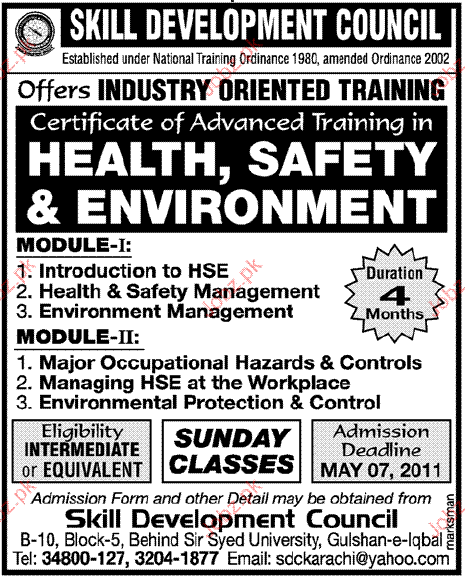 Admission Open in Health, Safety and Environment in Skill Development Council of Pakistan in Karachi Read newspaper ad for exact details.