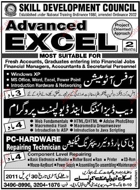 Admission Open in Office Automation, Web PC hardware and Repairing Technician in Designing and Skill Development Council in Karachi Read newspaper ad for exact details.