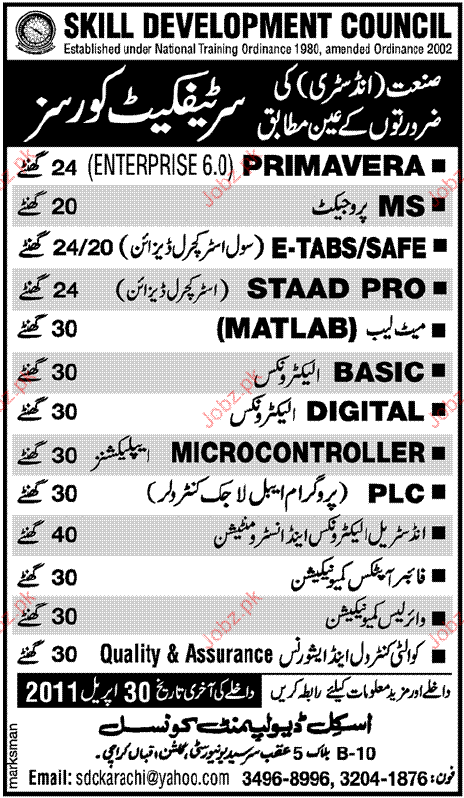 Admission Open in Different Technical Courses in Skill Development Council in Karachi Read newspaper ad for exact details.
