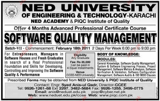 Admission Open in Software Quality Management in NED University in Karachi Read newspaper ad for exact details.