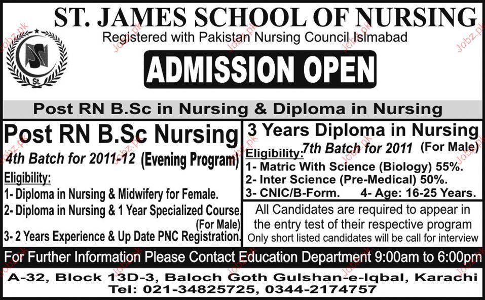 Admission Open in B.Sc Nursing in ST James School of Nursing in Karachi Read newspaper ad for exact details.