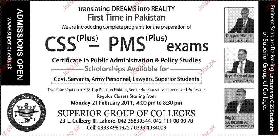 Admission Open in Preparatory Classes for CSS and PMS Superior Group of Colleges in Lahore Read newspaper ad for exact details.