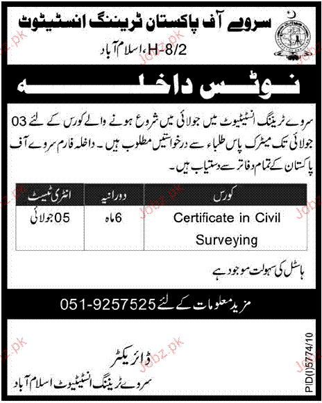 Admission Open in Survey of Pakistan Training Institute in Islamabad Read newspaper ad for exact details.
