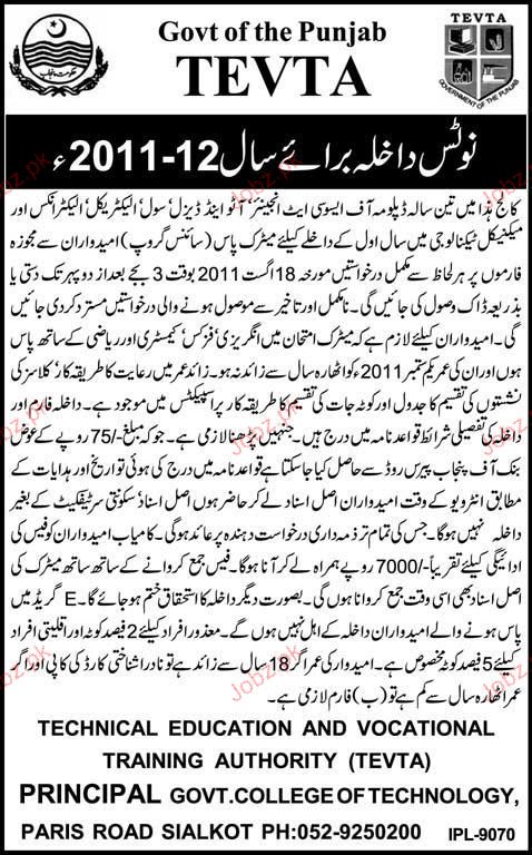 Admission Open in Technical Education Vocational Training in Sailkot Read newspaper ad for exact details.