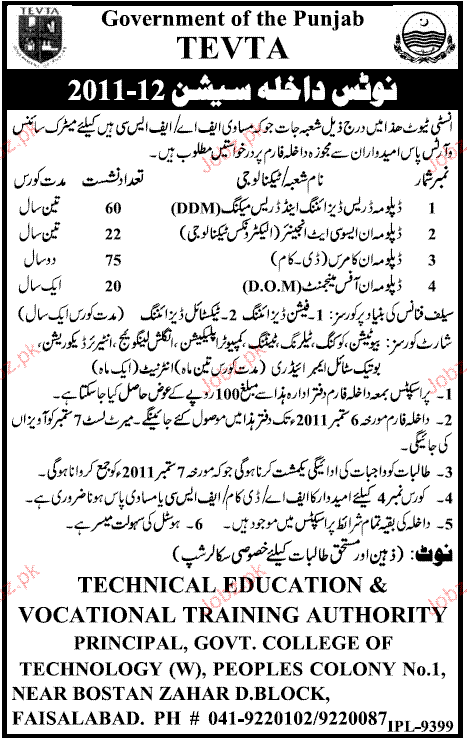 Admission Open in Technical Education Vocational Training in Faisalabad Read newspaper ad for exact details.