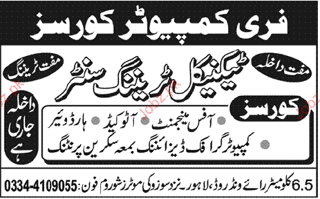 Admission Open in Technical Training Center in Lahore Read newspaper ad for exact details.