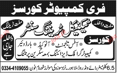 Admission Open in Technical Training Centre in Lahore Read newspaper ad for exact details.
