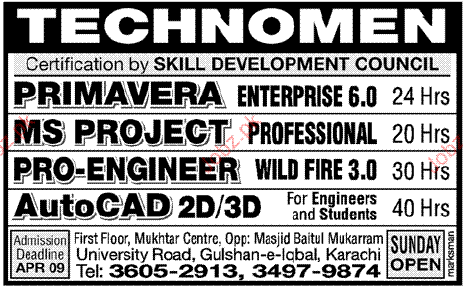 Admission Open in Technical Courses in Technomen in Karachi Read newspaper ad for exact details.