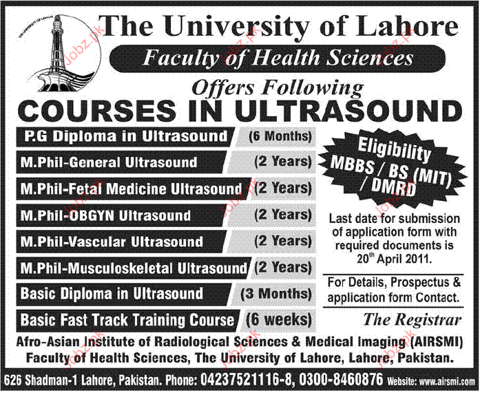 Admission Open in courses in Ultrasound in The University of Lahore Read newspaper ad for exact details.
