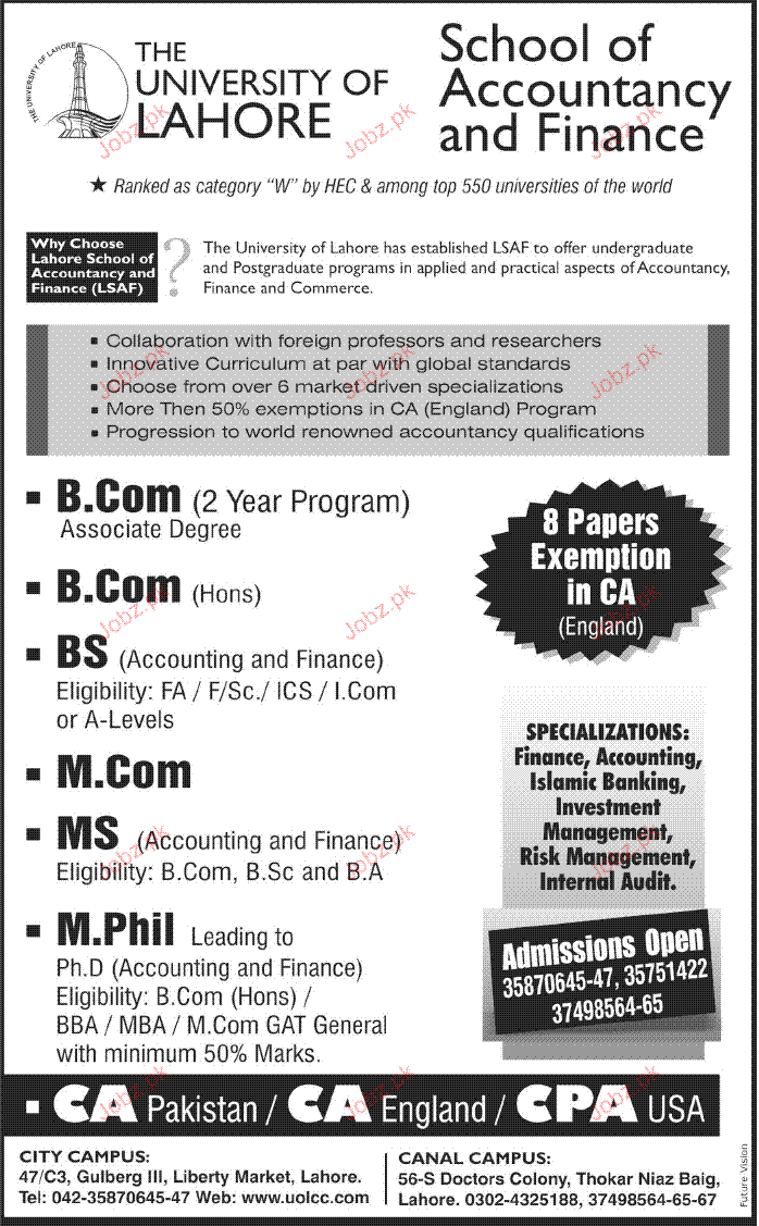 Admission Open in The University of Lahore in Lahore Read newspaper ad for exact details.
