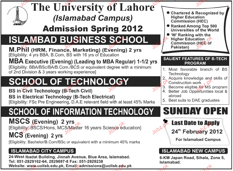 Admission Open in M.Phill, MBA, MSCS and MCS in The University of Lahore in Islamabad Campus Read newspaper ad for exact details.