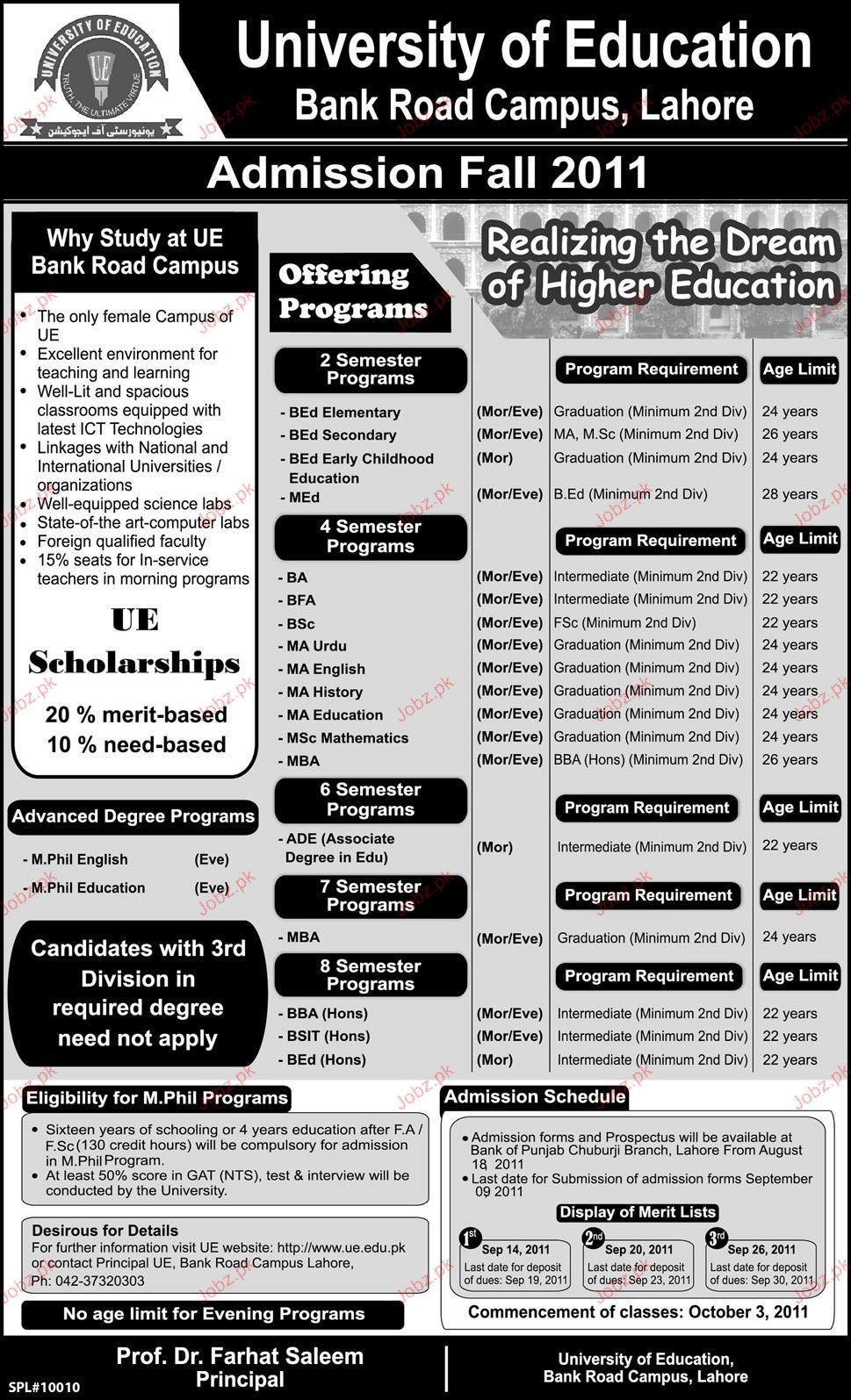 Admission Open in University of Education Lahore in Lahore Read newspaper ad for exact details.