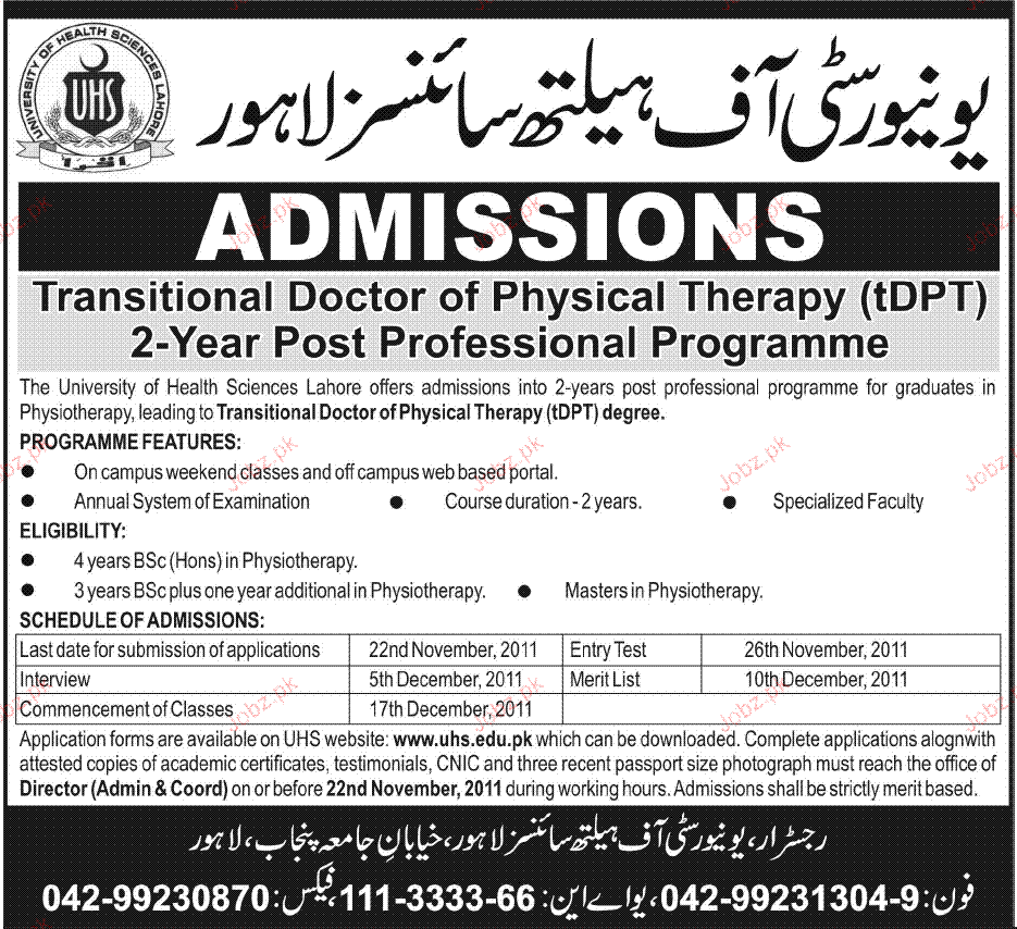 Admission Open in University Of Health Sciences in Lahore Read newspaper ad for exact details.