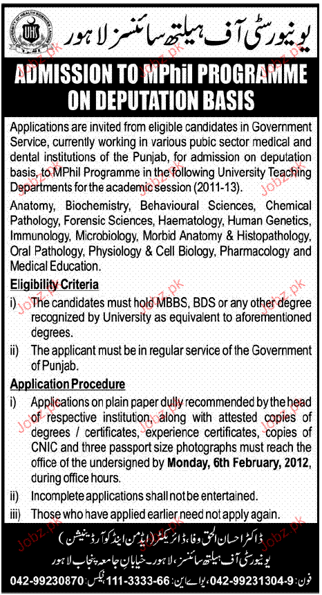 Admission Open in M.Phill in University of Health Sciences Lahore Read newspaper ad for exact details.