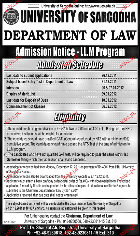 Admission Open in University of Sargodha in Sargodha Read newspaper ad for exact details.
