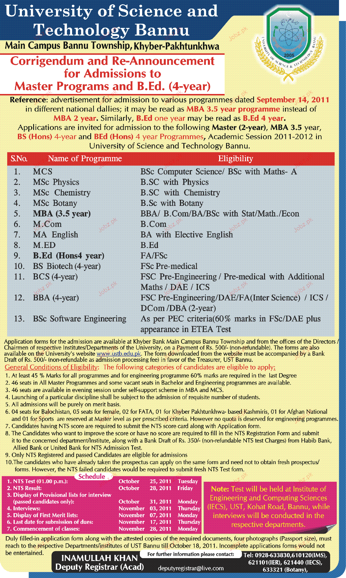 Admission Open in University of Science and Technology in Ban Read newspaper ad for exact details.