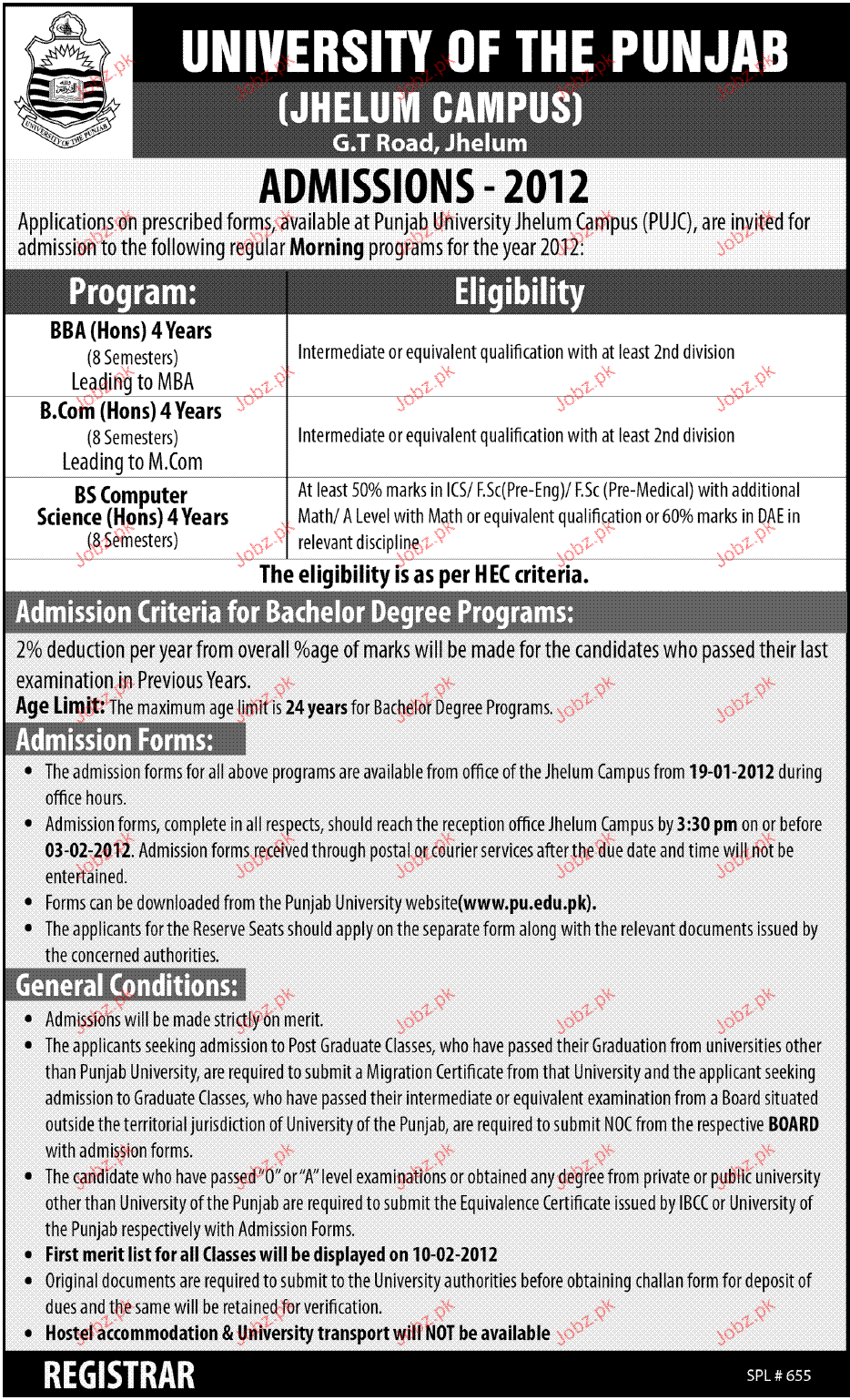 Admission Open in BBA, B.Com and BS Computer in University of The Punjab Jhelum Campus in Jhelum Read newspaper ad for exact details.