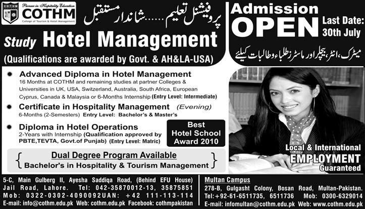 Admission Open n Institute of Tourism & Hotel Management in Lahore Read newspaper ad for exact details.