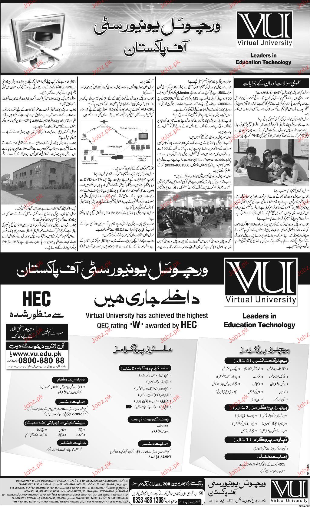 Admission in Phd, MS, MSc, M.Com, MA, BA, BS, BE, BBA, MBA and MFD in Virtual University in Lahore Read newspaper ad for exact details.