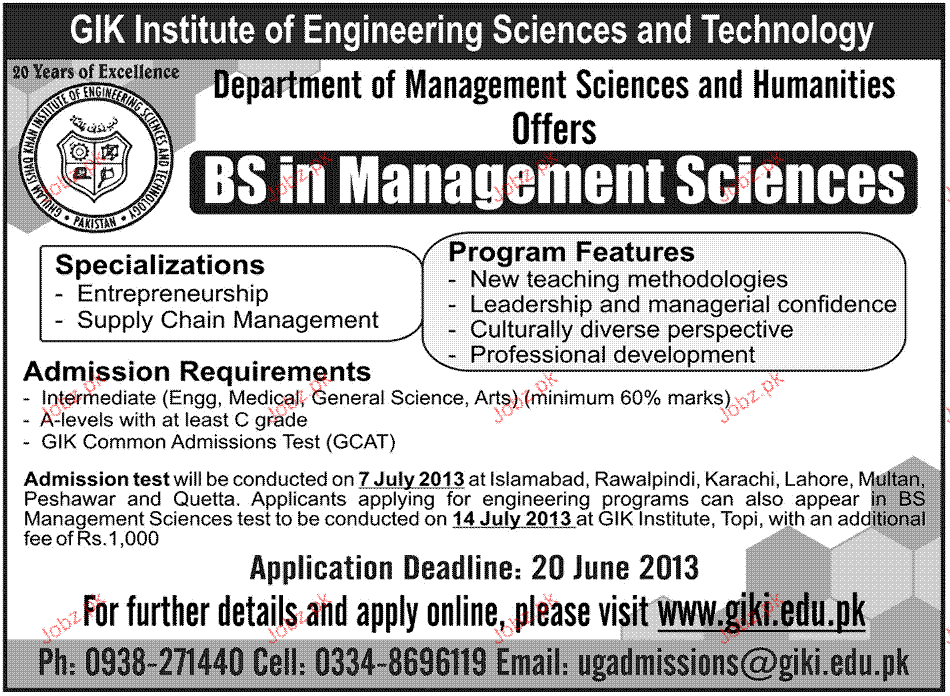 Admission in BS in Management Sciences in GIK Institute of Engineering Sciences and Technology in Swabi Read newspaper ad for exact details.