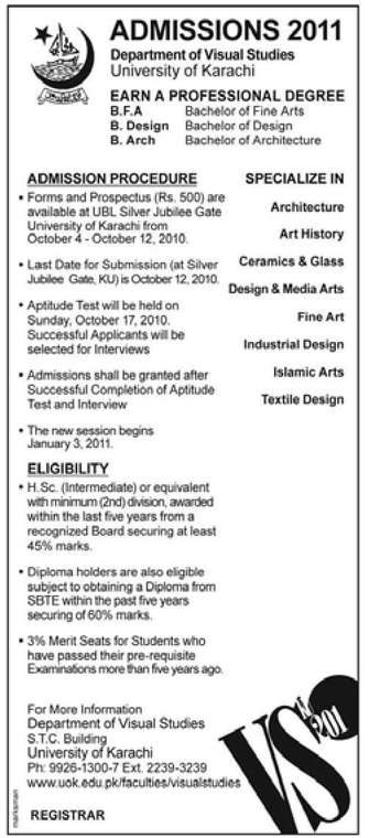 Admissions in B.FA, B.Design,etc in University of Karachi Read newspaper ad for exact details.